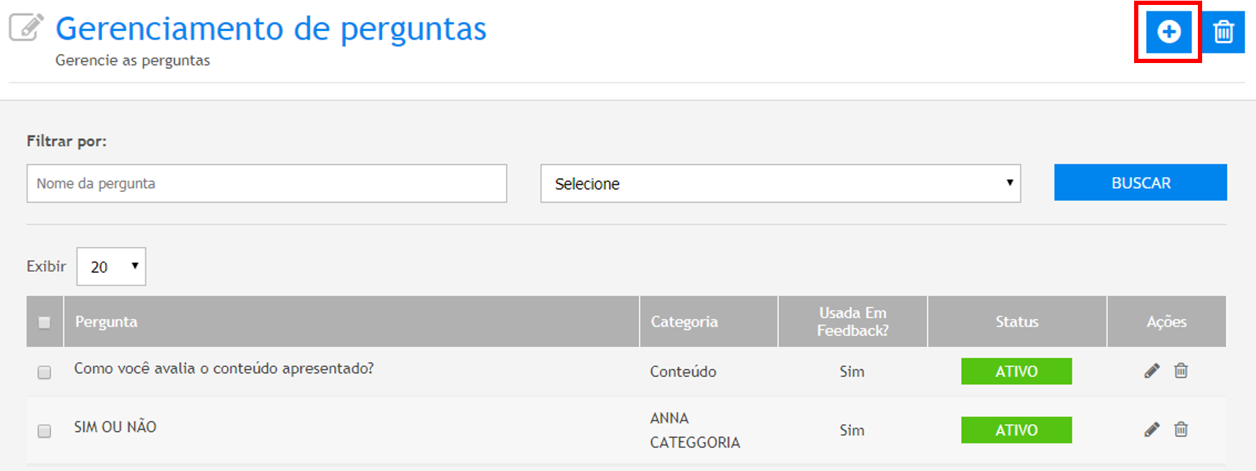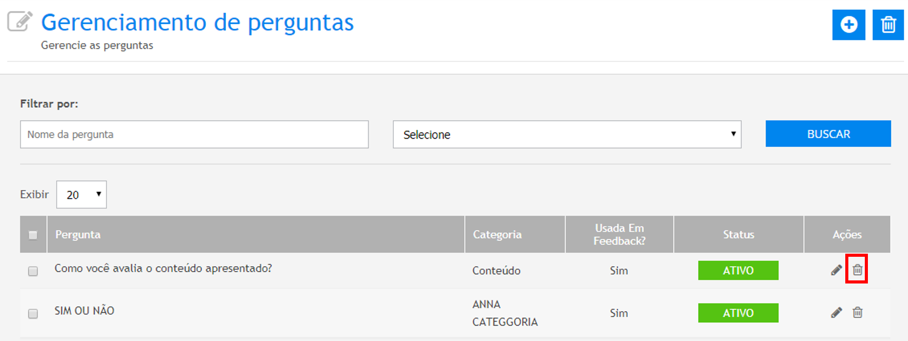 1. Na listagem de perguntas cadastradas, clique sobre o ícone “Excluir” na coluna ações.