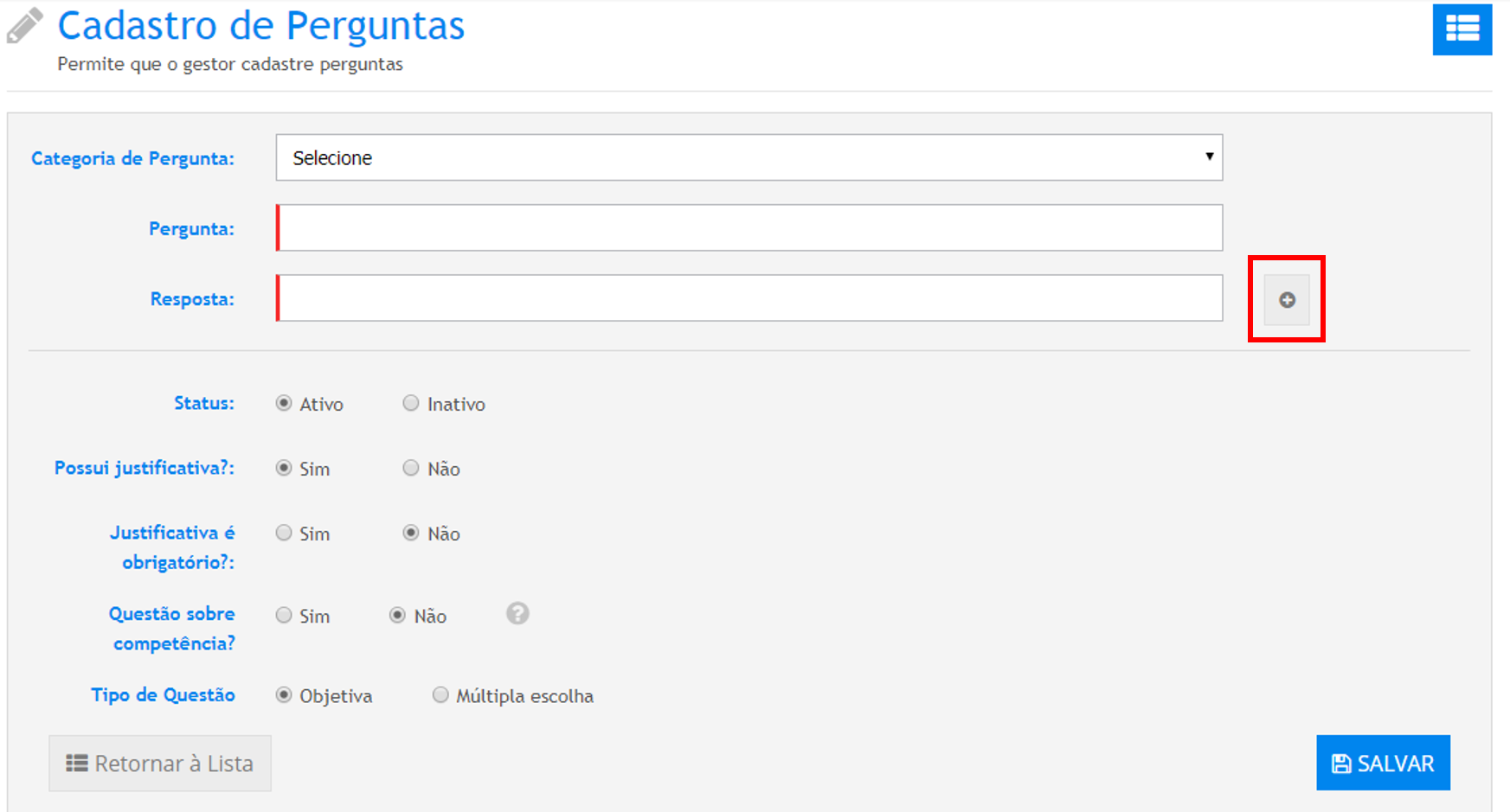 3. No campo “Resposta” insira a resposta referente a pergunta. Note que ao lado do campo resposta esta um ícone “Adicionar” (destacado na imagem acima). Acione este ícone caso queira incluir mais opções de resposta;