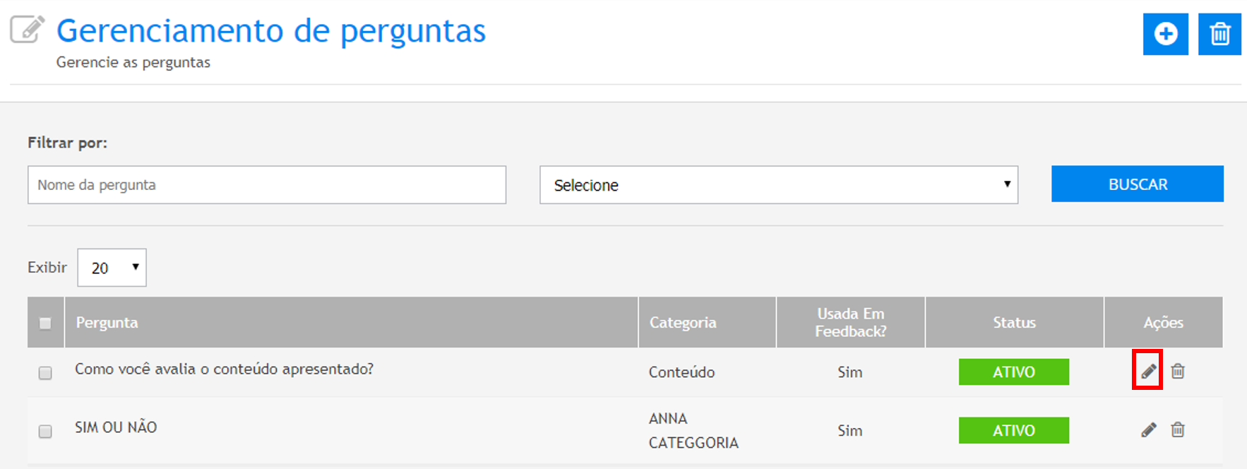 1. Na listagem de perguntas cadastradas, clique sobre o ícone “Editar” na coluna ações conforme destacado acima. As informações da pergunta serão exibidas.