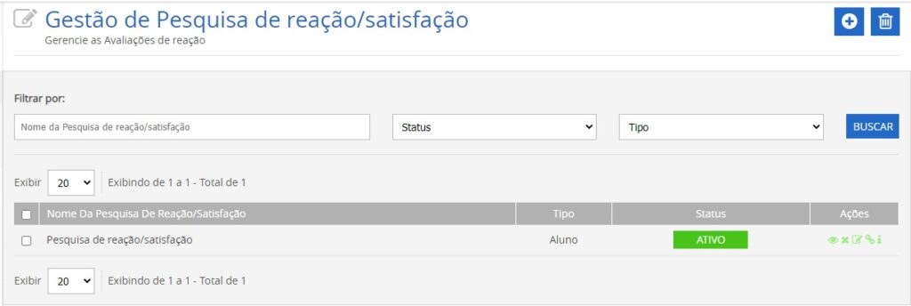 Para acessar a gestão de pesquisa de satisfação clicar em: Conteúdo » Feedback 2.0 » gestão de pesquisa de reação/satisfação