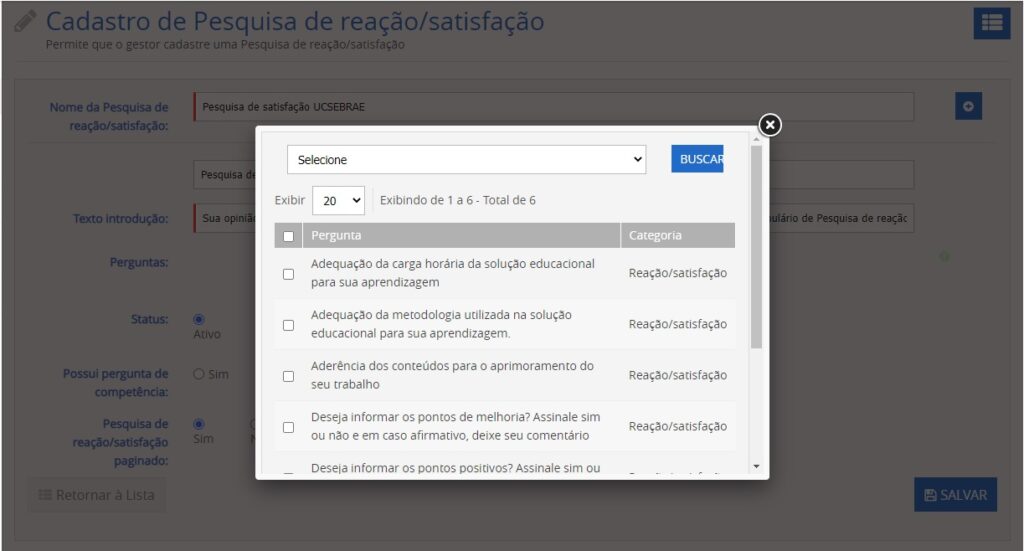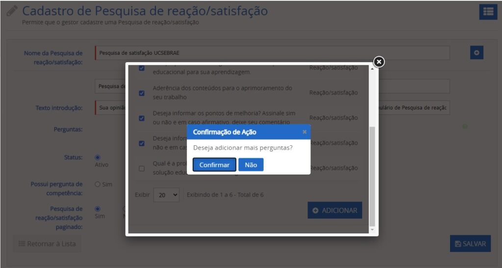 Agora podemos selecionar as perguntas que farão parte da lista de pesquisa e confirmar. Assim teremos uma pesquisa de reação/satisfação cadastrada: