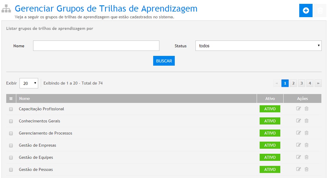 Na tela serão apresentadas as informações e a listagem de todos os grupos de Trilha existentes. Nessa tela, realize os seguintes passos:
