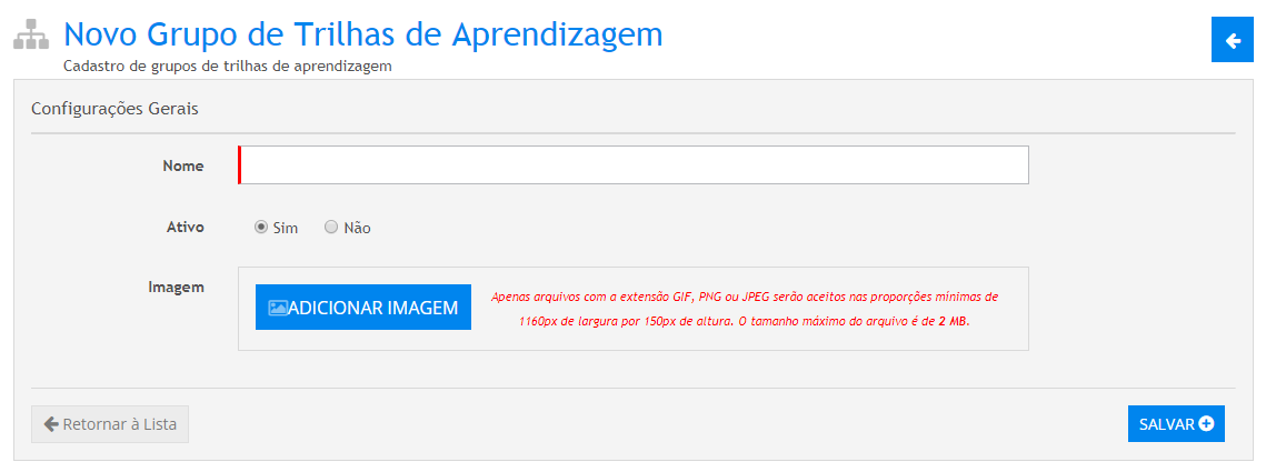 - No campo “Ativo”, determine o status do grupo. Lembrando que se ele estiver com status “Inativo”, mesmo que possua trilhas associadas a ele, não será exibido grupos com este status.
