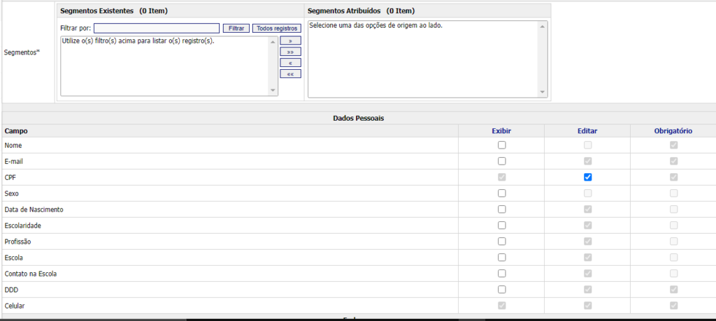 Essa configuração é para definir um segmento para o cadastro de aluno. Escolhendo o segmento, para cada campo será determinado se o mesmo será obrigatório, editável e/ou se fará ou não parte do cadastro. A opção “Exibir” torna o campo oculto ou não no cadastro, a opção “Editar” permite se será alterado e a opção “Obrigatório” se o campo será obrigatório ou não.