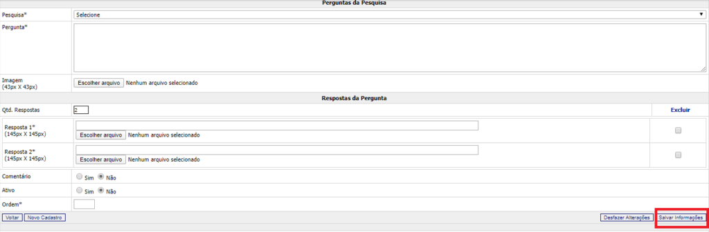 Através do menu Administrativo>>Pesquisas>>Perguntas e Respostas, você poderá cadastrar as perguntas e respostas da Pesquisa.