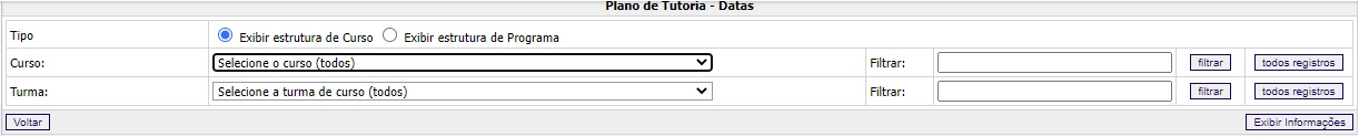- Na área “Tipo”, escolha se deseja exibir estrutura de curso ou estrutura de Programa. Ao optar pela exibição da estrutura de curso, você deverá selecionar, através das combos, o curso e a turma; e Programa, turma de Programa, curso e turma se marcar a opção de exibir a estrutura de Programa.