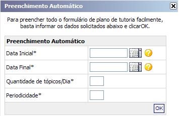 Tela 03 – Preenchimento automático de datas - Na janela “Preenchimento Automático”, informe a “Data Inicial” e a “Data Final” do curso, a “Quantidade de tópicos /Dia” que o aluno poderá acessar e a “Periodicidade”, isto é, o intervalo de dias para acesso aos tópicos do curso. Normalmente, essa periodicidade é definida para todos os dias, então se coloca o valor 01 (um). Em seguida, clique em OK.