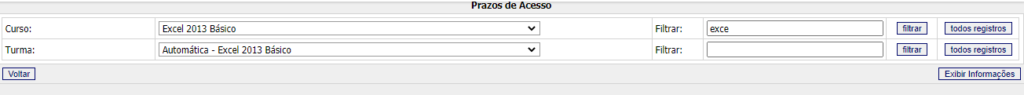 No menu Curricular >> Prazos de Acesso >> Turmas de curso, o sistema apresenta a tela de prazo de acesso. O prazo de acesso do aluno numa determinada turma será apresentado após filtrar utilizando as opções de curso e turma.