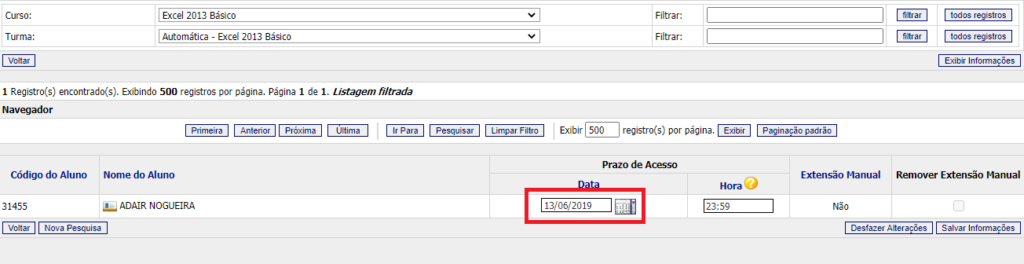 Após filtrar os alunos da turma. Para alterar a data, clicar na data prazo de acesso e clicar em Salvar Informações, ao clicar o sistema altera o prazo.