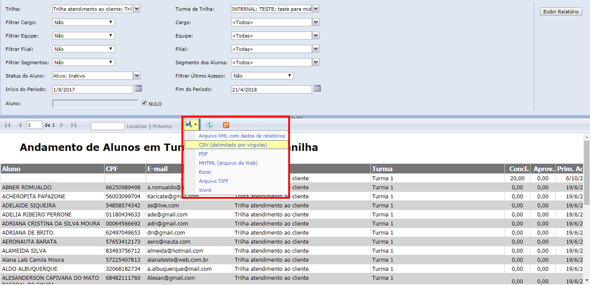 Clique no item destacado na imagem acima e escolha em qual formato deseja extrair o relatório.