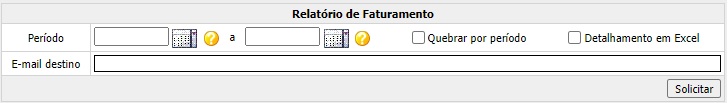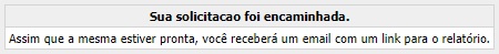 O usuário informa o período sendo data início e data fim do faturamento, se quebra por período, se quer detalhamento em Excel e informa o e-mail. Após informar os dados é só clicar em solicitar. Após clicar o sistema recebe a solicitação, exibe uma mensagem(tela abaixo), prepara o relatório e em seguida envia para o e-mail informado na solicitação.