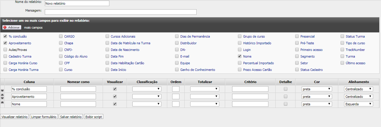 Por meio do recurso Gestor Estatístico » Relatórios Personalizados » Novo você poderá cadastrar relatórios personalizados de “Alunos”, “Estatísticas do Curso”, “Pesquisa de reação/satisfação” e “Situação na turma”. Após definir os itens que constarão no relatório (esses itens irão variar de acordo com o tipo de relatório que você deseja montar) e preenchimento dos campos, o usuário poderá salvá-lo e disponibilizá-lo na área de “Relatórios salvos” (em Gestor Estatístico » Relatórios Personalizados » Relatórios salvos).