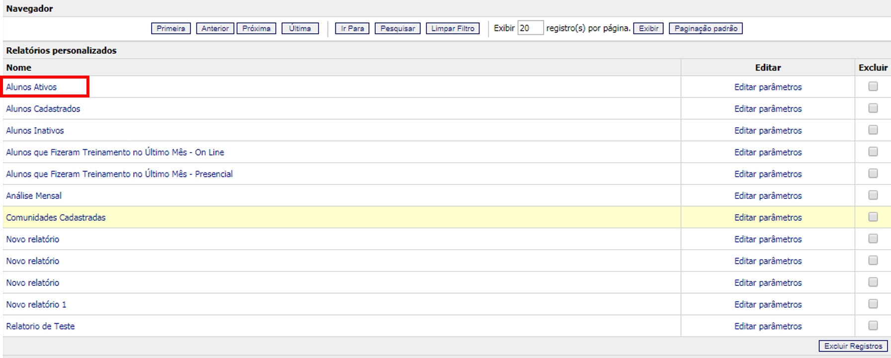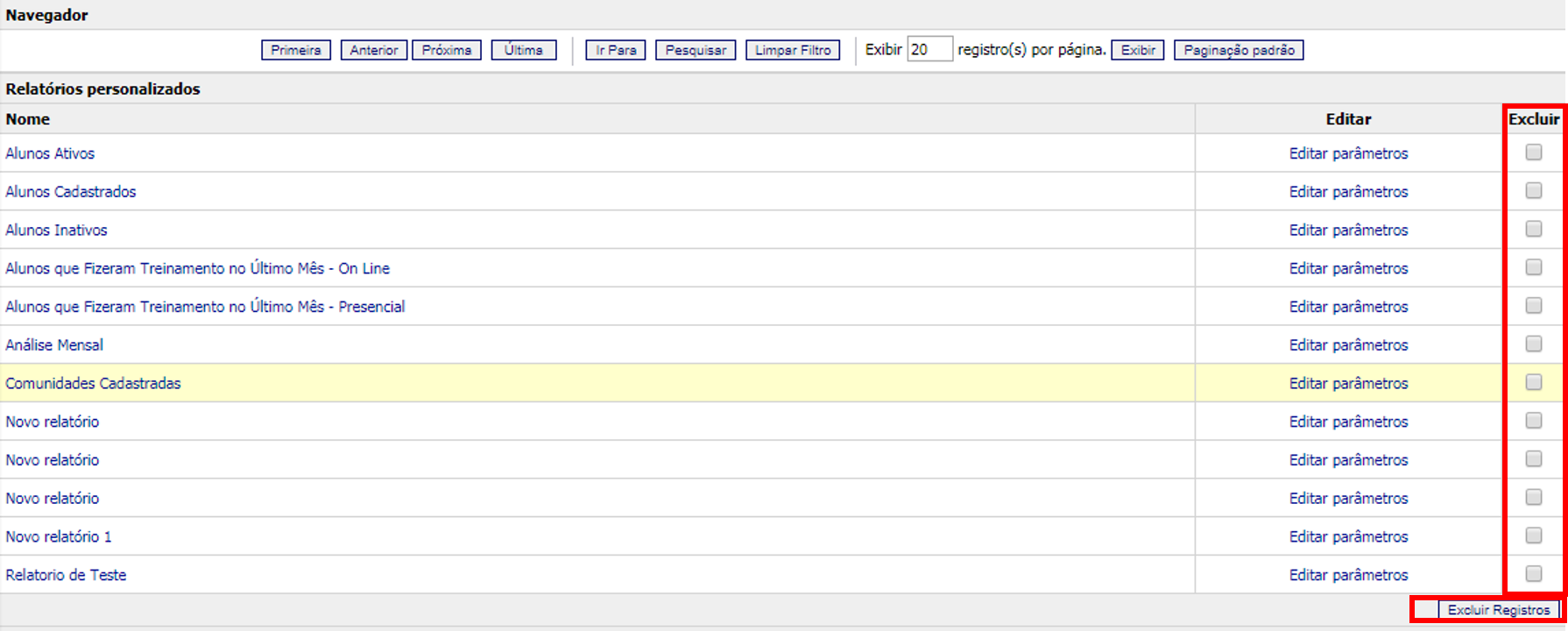 Na coluna “Excluir”, selecione o relatório que deseja excluir e clique no botão “Excluir Registros”.