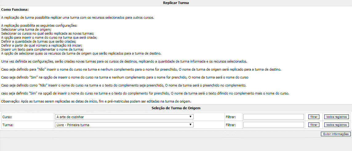 - Selecione o curso e a turma de origem, isto é, a turma a ser replicada. Em seguida, acione o botão Exibir Informações.