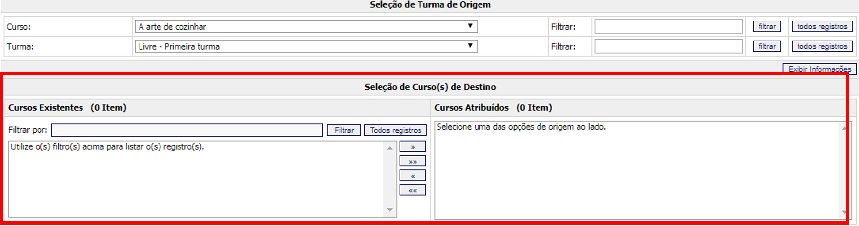 - Na área “Seleção de Curso(s) de Destino”, escolha o(s) curso(s) para o(s) qual(is) será replicada a turma de origem, através das combos, e dê um duplo clique sobre ele(s). Se necessário, clique em Todos os registros para exibir todos os cursos existentes ou faça uma busca específica digitando a palavra-chave dos itens a serem pesquisados no campo “Filtrar por” e, logo após, clique no botão Filtrar.