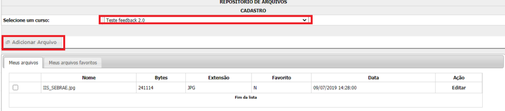 Para cadastrar arquivos para o Plano de Tutoria vá ao menu Conteúdo » Repositório » Arquivos.