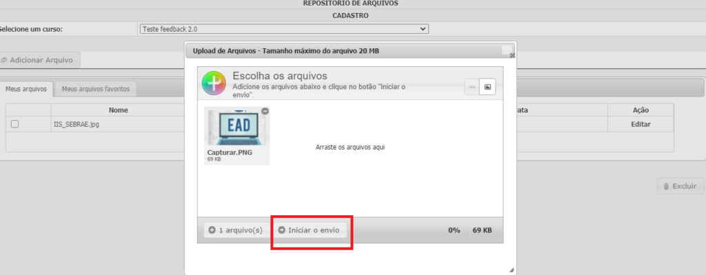 Clique em Iniciar o envio, para cadastrar o arquivo.