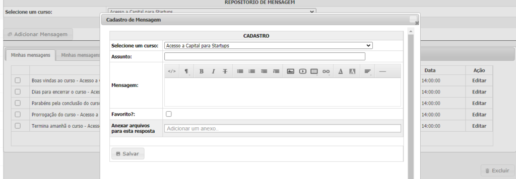 Para cadastrar arquivos para o Plano de Tutoria vá ao menu Conteúdo » Repositório » Mensagem.