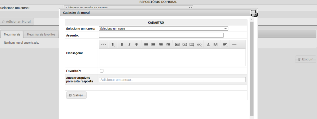 Para cadastrar arquivos para o Plano de Tutoria vá ao menu Conteúdo » Repositório » Mural.