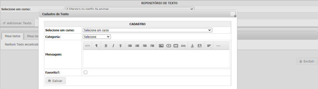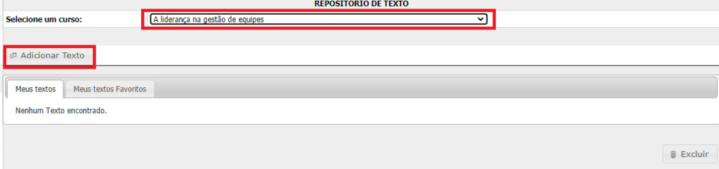 Para cadastrar arquivos para o Plano de Tutoria vá ao menu Conteúdo » Repositório » Textos.
