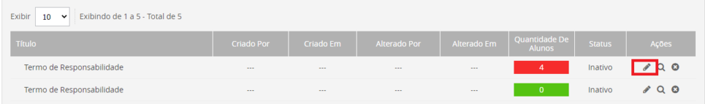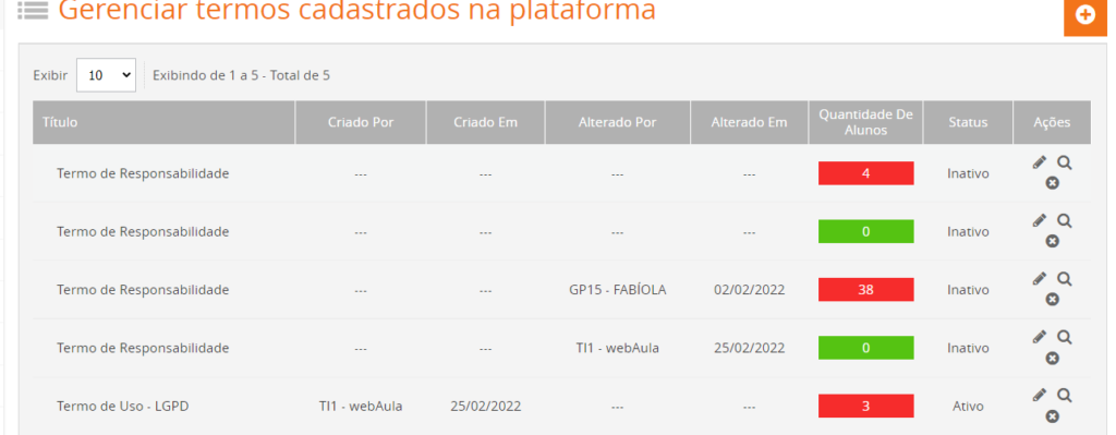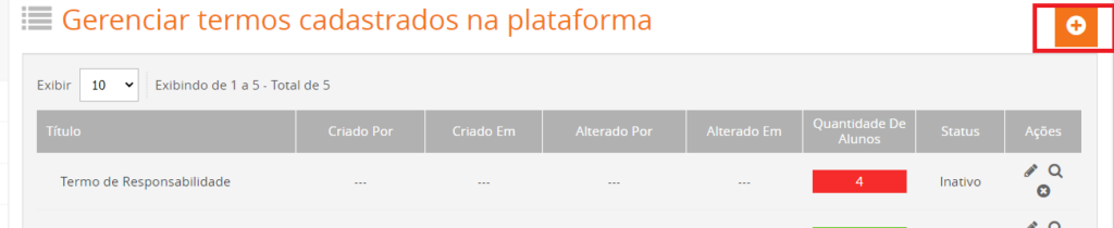 Acessando o menu Administrativo » Configurações » Termo de Uso, serão exibidos todos os Termos de Uso cadastrados na plataforma.