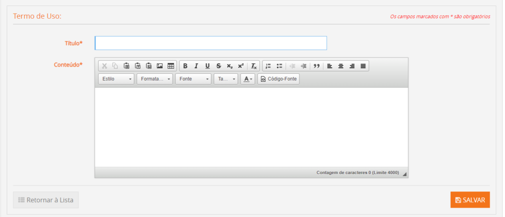 1. No campo “Título”, informe um nome para o Termo de Uso a ser cadastrado.