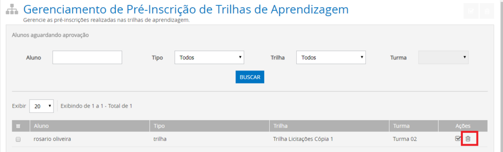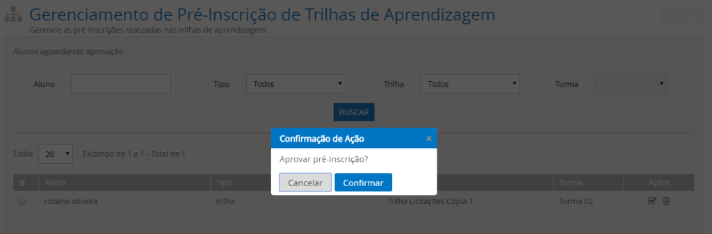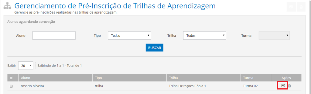 Através do menu Conteúdo » Trilhas de Aprendizagem 2.0 » Gerenciamento de Pré-inscrição, você poderá aprovar ou negar a aprovação de matriculas de alunos em turma de trilha 2.0.