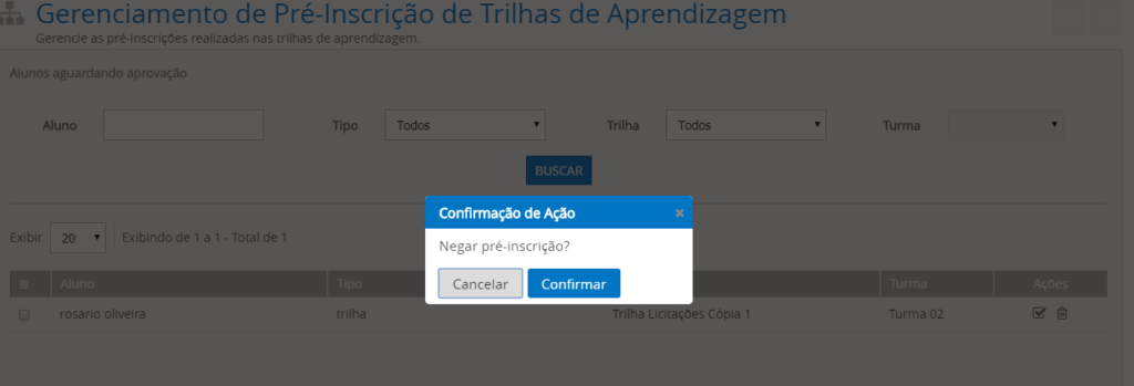 Clique em confirmar para negar a matrícula na turma de trilha.2.0