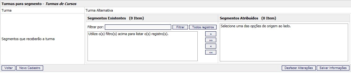 • Na combo “Segmentos Existentes”, selecione o(s) segmento(s) a ser(em) atribuído(s) à turma de curso.