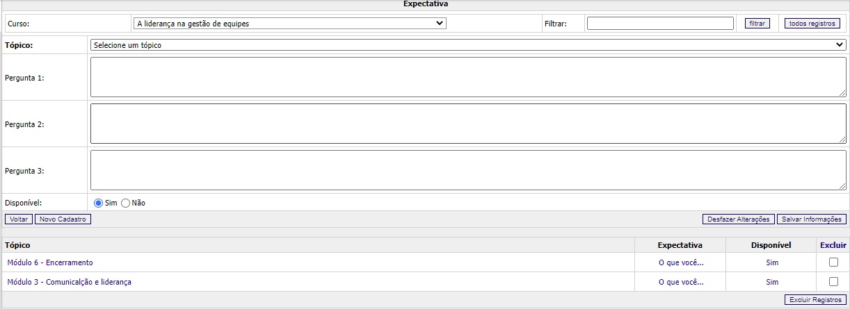 Através do menu Tutoria » Expectativa, você poderá cadastrar, alterar, consultar ou excluir questões relacionadas a expectativa do curso. O sistema apresenta a tela: