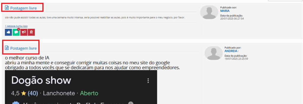 Para acessar o grupo, basta clicar no botão “Acessar Grupo Colaborativo”. Após acessar um grupo colaborativo, você terá acesso a todos os itens postados, assim como quem realizou a publicação com registro de data e hora, e poderá também realizar postagens conforme as opções disponibilizadas. Confira na tela abaixo: