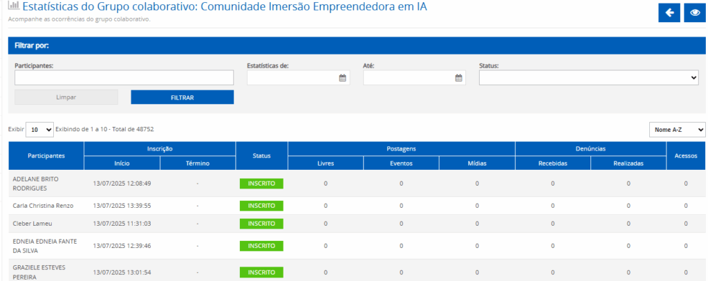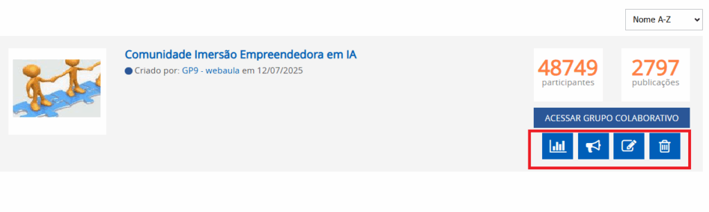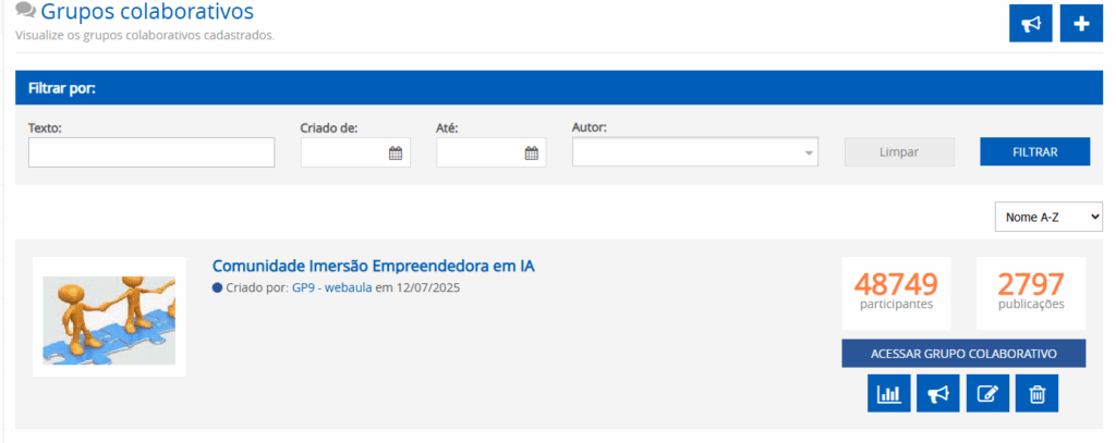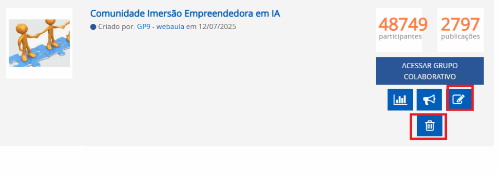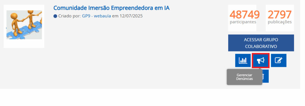 O administrador poderá acessar os dados estatísticos do Grupo Colaborativo com o objetivo de visualizar as participações de seus integrantes. Logo abaixo do botão “Acessar Grupo Colaborativo”, você terá acesso a botões de atalho para funções como: Acessar dados estatísticos do grupo, visualizar denúncias, e editar ou excluir o grupo.